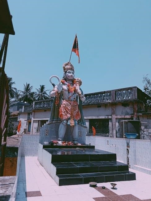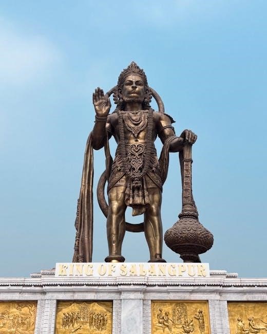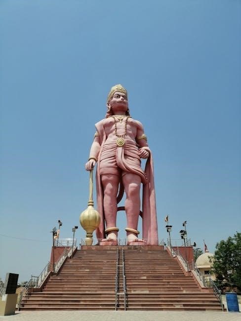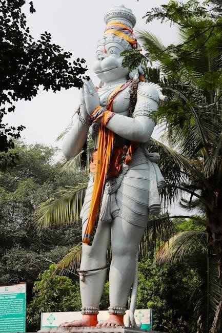 Hanuman, a central figure in Hindu mythology, is revered as a symbol of strength, devotion, and selfless service․ Often depicted as a mighty monkey god, he embodies unwavering loyalty to Lord Rama and is celebrated for his heroic deeds in the epic Ramayana․ His incredible strength allowed him to move mountains and cross oceans, demonstrating his extraordinary capabilities․