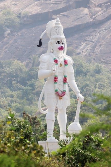 Hanuman, a central figure in Hindu mythology, is revered as a symbol of strength, devotion, and selfless service․ Often depicted as a mighty monkey god, he embodies unwavering loyalty to Lord Rama and is celebrated for his heroic deeds in the epic Ramayana․ His incredible strength allowed him to move mountains and cross oceans, demonstrating his extraordinary capabilities․